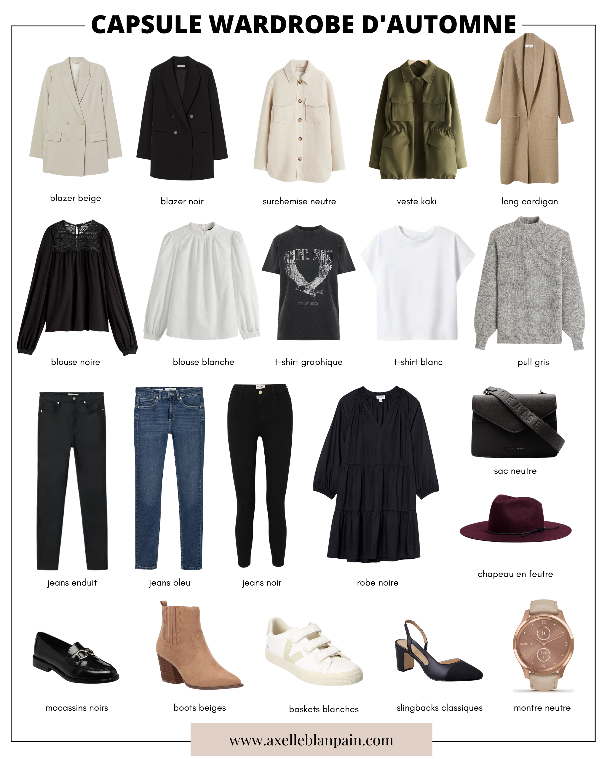 MOCASSINS NOIRS | BOOTS BEIGES | BASKETS BLANCHES | SLINGBACKS CLASSIQUES | MONTRE NEUTRE